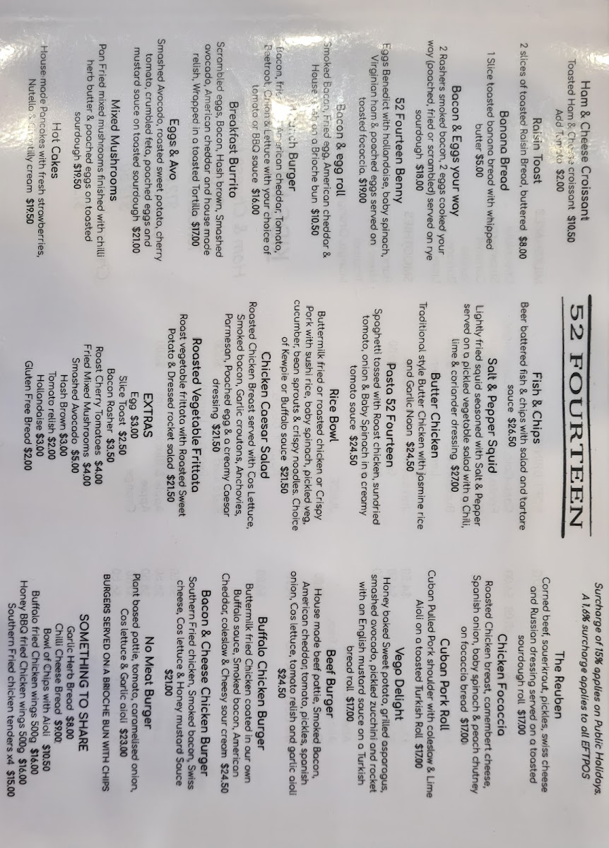 The menu at Cafe 52 Fourteen offers a variety of options suitable for breakfast, coffee breaks, and light meals throughout the day. Visitors can expect a selection of coffee and other beverages, including decaffeinated options and smoothies. The food choices encompass both light bites and more substantial dishes, providing options for different appetites.